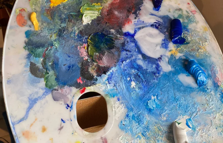 Just a quick mention of the colours I use in all my oil paintings. In anti-clockwise direction, Titanium White, Cerulean Blue, Cobalt Blue, Ultramarine Blue, Cadmium Red, Alizarin Crimson, Lemon Yellow, Chrome Yellow and Turners Yellow.