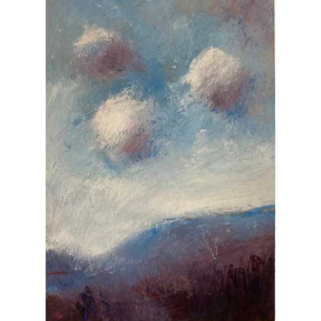 Geschilderd op Brading downs in november, toont het schilderij het koele winterlicht terwijl de zon begint onder te gaan.