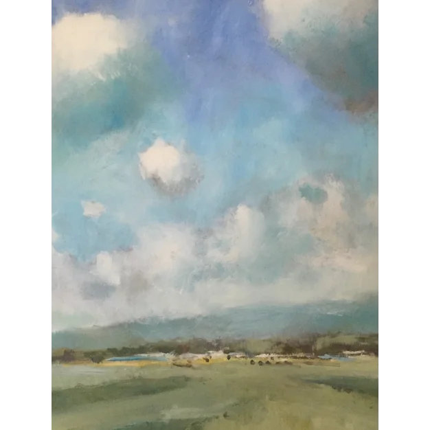 In het vroege zomer geschilderd, gaat het schilderij over de schaduwen van de wolken en de diepe blauwtinten van de lucht.